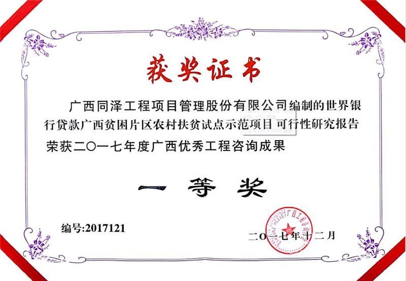 世辦銀行貸款廣西貧困片區(qū)農(nóng)村扶貧試點(diǎn)示范項(xiàng)目可行性研究報告榮獲2017年度廣西優(yōu)秀工程咨詢成果一等獎